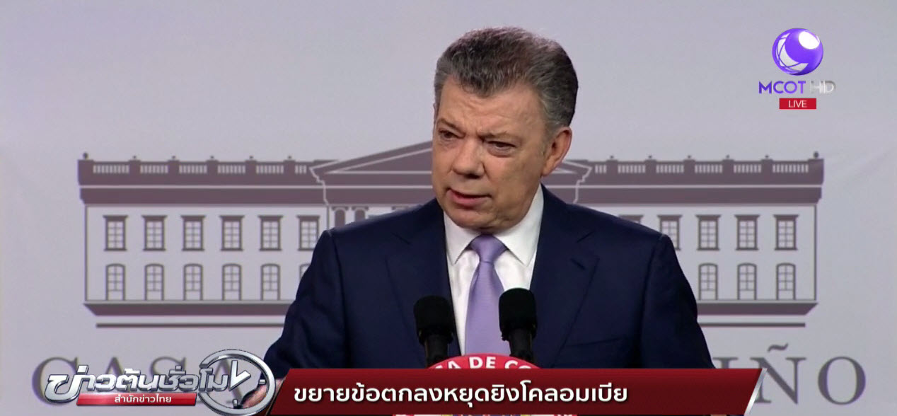 โคลอมเบีย 20 ธ.ค.-ประธานาธิบดีฮวน มานูเอล ซานโตส ผู้นำโคลอมเบีย ตั้งนายกุสตาโว เบล อดีตรองประธานาธิบดี เป็นหัวหน้าผู้เจรจาสันติภาพกับกลุ่มกบฏอีแอลเอ็น โดยหวังขยายเวลาของข้อตกลงหยุดยิงที่จะสิ้นสุดลงในวันที่ 9 มกราคมปีหน้า ขณะที่กลุ่มอีแอลเอ็นระบุพร้อมให้ความร่วมมือหากการเจรจาสันติภาพเพื่อยุติสงครามกลางเมืองที่ดำเนินมานานกว่า 53 ปี มีความคืบหน้า เมื่อปลายปีที่แล้วประธานาธิบดีซานโตสได้ลงนามข้อตกลงสันติภาพกับกลุ่มกบฏฟาร์ก ซึ่งปัจจุบันได้จัดตั้งเป็นพรรคการเมืองเพื่อลงชิงชัยในการเลือกตั้งกับฝ่ายรัฐบาล.-สำนักข่าวไทย