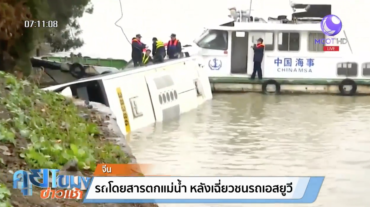 จีน 8 ม.ค.-รถโดยสารคันหนึ่งในประเทศจีนเสียหลักพุ่งตกลงแม่น้ำหลังเฉี่ยวชนรถยนต์คันหนึ่งบนถนนในมณฑลเจียงซู ทางตะวันออกของประเทศจีน โชคดีไม่มีผู้เสียชีวิต