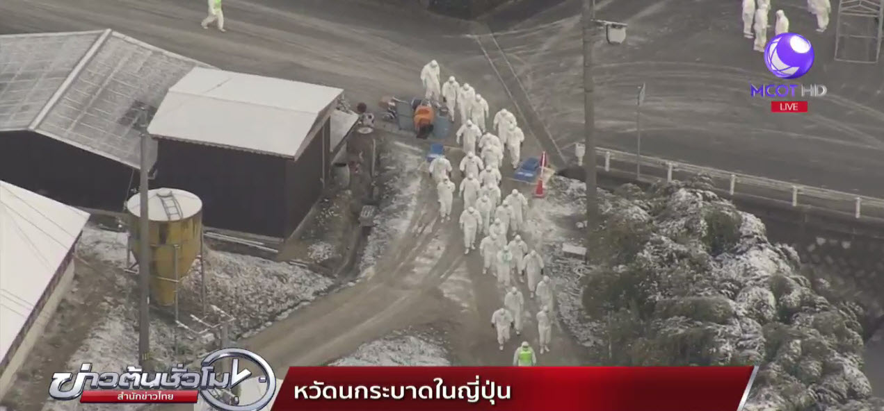 ญี่ปุ่น 12 ม.ค. – หลังพบการแพร่ระบาดของเชื้อหวัดนกสายพันธุ์ H5 ที่ฟาร์มสัตว์ปีกแห่งหนึ่งในเมืองซานุกิ ทางตะวันตกของญี่ปุ่น เจ้าหน้าที่ได้ฆ่าสัตว์ปีกภายในฟาร์มและบริเวณโดยรอบแล้วกว่า 90,000 ตัว พร้อมระงับการขนส่งสัตว์ปีกและไข่ในบริเวณดังกล่าว หวังหยุดยั้งการแพร่ระบาดในครั้งนี้ นับเป็นการระบาดของเชื้อหวัดนกที่เกิดขึ้นกับสัตว์ปีกภายในฟาร์มเป็นครั้งแรกในช่วงฤดูหนาวนี้. – สำนักข่าวไทย