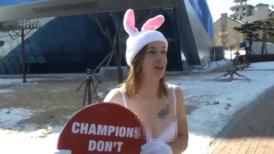 พย็องชัง 6 ก.พ.- นักเคลื่อนไหวเพื่อสิทธิสัตว์ในชุดกระต่ายเกือบเปลือยท่ามกลางสภาพอากาศเย็นยะเยือกช่วงเข้าสู่การแข่งขันกีฬาโอลิมปิกฤดูหนาวพย็องชังในวันนี้ เพื่อประท้วงการค้าขนสัตว์ แต่ไม่แตะประเด็นการบริโภคเนื้อสุนัขในเกาหลีใต้
