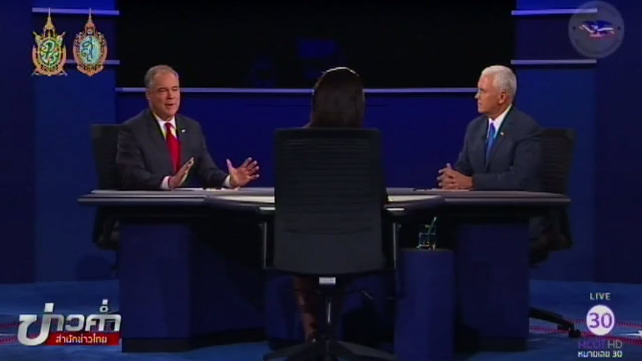 สหรัฐ 5 ต.ค.-การดีเบตประชันวิสัยทัศน์เพียงรอบเดียว ของคู่ชิงตำแหน่งรองประธานาธิบดีสหรัฐ เป็นไปอย่างดุเดือดโดยทั้งสว.ทิม เคน จากรัฐเวอร์จิเนีย คู่ชิงรองประธานาธิบดีของนางฮิลลารี คลินตัน จากพรรคเดโมแครต กับนายไมค์ เพนซ์ คู่ชิงรองประธานาธิบดี ของนายโดนัลด์ ทรัมป์ จากพรรครีพับลิกันต่างโจมตี เจ้านายของกันและกัน โดยนายทรัมป์ถูกเปรียบเทียบว่า เป็นคนโง่และคนบ้า ส่วนฮิลลารี คลินตัน ถูกเปรียบเทียบว่า เป็นคนอ่อนแอ ขณะที่โพลของ CNN ระบุว่า ไมค์ เพนซ์ โต้วาที ชนะนายทิม เคน ด้วยคะแนน 48 ต่อ 46