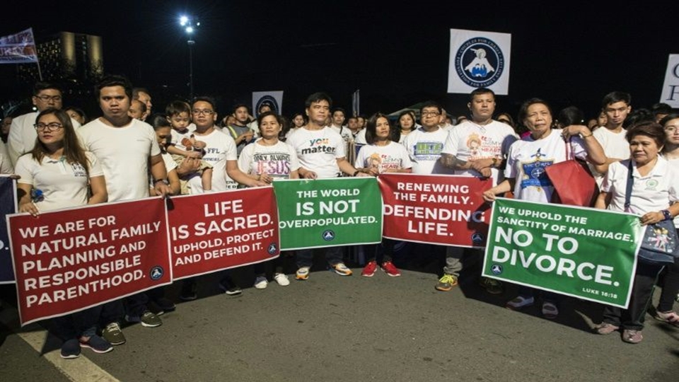 มะนิลา 24 ก.พ.- ชาวคริสต์คาทอลิกราว 2,000 คนชุมนุมในกรุงมะนิลาของฟิลิปปินส์ตั้งแต่เช้ามืดวันนี้ คัดค้านการผ่านร่างกฎหมายให้การหย่าเป็นสิ่งถูกกฎหมาย และถือโอกาสประนามการทำสงครามปราบปรามยาเสพติดของประธานาธิบดีโรดริโก ดูเตอร์เต