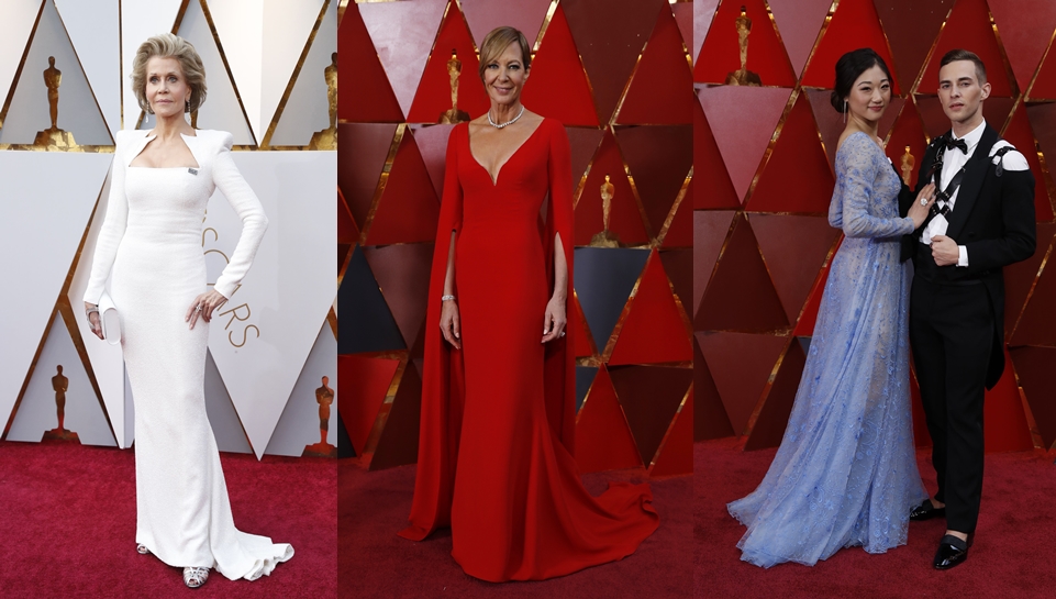 นักแสดงหญิงหลายคนสวมชุดสีขาวหรือสีครีมที่เป็นสัญลักษณ์ของสตรีที่เรียกร้องสิทธิเลือกตั้ง เช่น เจน ฟอนดา นักแสดงรุ่นลายครามวัย 80 ปี ขณะที่หลายคนมาในชุดสีแดงสดใสอย่างแอลลิสัน แจนนีย์วัย 58 ปีที่ได้รับการเสนอชื่อเข้าชิงสาขานักแสดงสมทบหญิงยอดเยี่ยมจากเรื่อง I,Tonya เมอรีล สตรีป เจ้าของออสการ์ 3 ตัววัย 68 ปี ที่ได้รับการเสนอชื่ออีกครั้งในปีนี้สาขานักแสดงนำหญิงยอดเยี่ยมจากเรื่อง The Post ด้านนักกีฬาโอลิมปิกฤดูหนาวที่เพิ่งเสร็จสิ้นจากการแข่งขันที่พย็องชังของเกาหลีใต้ก็มาร่วมเดินพรมแดงออสการ์เช่นกัน เช่น มิราอิ นะกะสุ นักสเก็ตลีลาเจ้าของเหรียญทองแดง สวมชุดสีม่วงอ่อน ลินซีย์ วอนน์ นักสเก็ตดาวน์ฮิลล์เจ้าของเหรียญทองแดง สวมชุดสีดำ