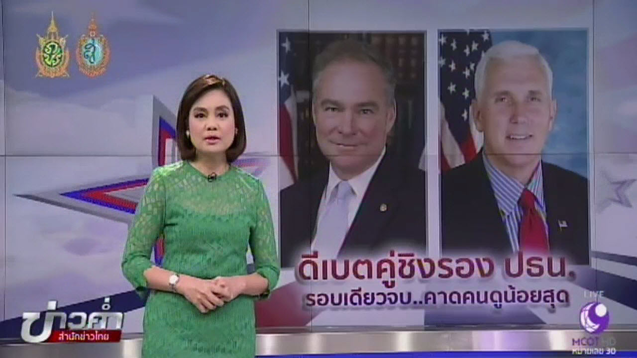 สหรัฐ 4 ต.ค.-ศึกเลือกตั้งประธานาธิบดีสหรัฐ กำลังขับเคี่ยวกันอย่างสนุก โดยในวันพรุ่งนี้ตามเวลาในบ้านเรา คู่ชิงตำแหน่งรองประธานาธิบดีสหรัฐ คือวุฒิสมาชิก ทิม เคน จากรัฐเวอร์จิเนีย คู่ชิงของนางฮิลลารี คลินตัน จากพรรคเดโมแครต กับนายไมค์ เพนซ์ ผู้ว่าการ รัฐอินดีแอนา คู่ชิงของโดนัลด์ ทรัมป์ จากพรรครีพับลิกัน จะขึ้นเวทีดีเบตประชันวิสัยทัศน์กันซึ่งจัดขึ้นเพียงรอบเดียว ที่มหาวิทยาลัยลองวู้ด เมืองฟาร์มวิล รัฐเวอร์จิเนีย โดยคาดว่า จะมีคนเฝ้าชมการถ่ายทอดสด ทั้งทางทีวีและสื่อสังคมออนไลน์น้อยที่สุดเท่าที่เคยมีมา เนื่องจากว่าบุคคลทั้ง 2 ค่อนข้างโนเนมไม่ค่อยมีคนรู้จัก และไม่มีอะไรเป็นจุดขาย