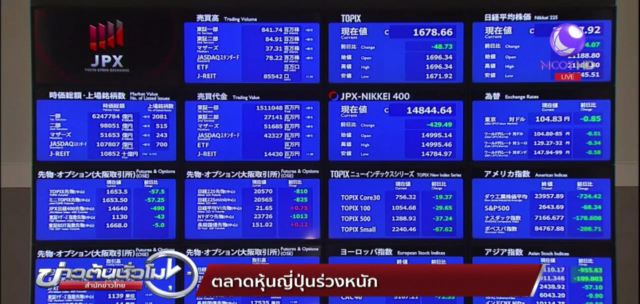 ดัชนีนิเกอิของตลาดหุ้นญี่ปุ่น ปิดตลาดวันนี้ร่วงไป 974.13 จุด ไปอยู่ที่ 20,617.86 จุด ต่ำสุดนับตั้งแต่วันที่ 5 ตุลาคมปีที่ผ่านมา เหตุจากนักลงทุนหวาดวิตกว่าจะเกิดสงครามการค้าระหว่างจีนและสหรัฐ หลังประธานาธิบดีโดนัลด์ ทรัมป์ ประกาศจะขึ้นภาษีนำเข้าเหล็กและอะลูมิเนียมจากประเทศต่างๆ รวมทั้งจีน ความวิตกดังกล่าวยังส่งผลลบต่อตลาดหุ้นเซี่ยงไฮ้และฮ่องกงด้วย.-สำนักข่าวไทย