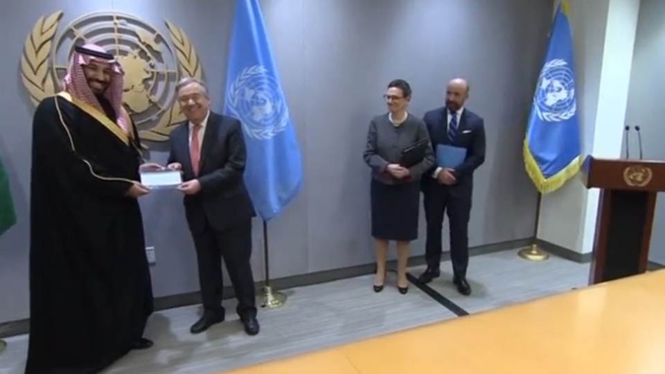 สหประชาชาติ 28 มี.ค. – ซาอุดีอาระเบียมอบเช็คจำนวน 930 ล้านดอลลาร์สหรัฐให้แก่สหประชาชาติเพื่อให้ความช่วยเหลือด้านมนุษยธรรมในเยเมน ขณะที่นายอันโตนิโอ กูเตอร์เรส เลขาธิการสหประชาชาติกำลังพยายามหาทางยุติสงครามซึ่งมีซาอุดีอาระเบียเป็นแกนนำในการแทรกแซงทางทหาร