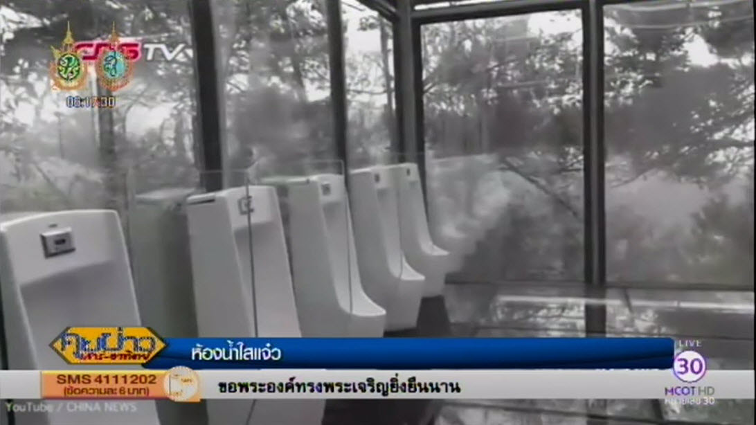 จีน 2 ต.ค.-แหล่งท่องเที่ยวแห่งหนึ่งของจีนเปิดให้บริการห้องน้ำสาธารณะแห่งใหม่ที่ทำด้วยกระจกใส สามารถมองเห็นสภาพแวดล้อมภายนอกได้ชัดเจน