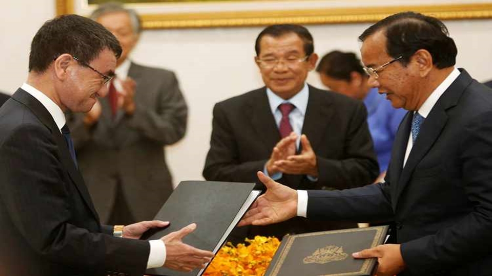 นายทาโร โคโนะ รัฐมนตรีต่างประเทศญี่ปุ่นและนายปรัก สุคน รัฐมนตรีต่างประเทศกัมพูชาลงนามข้อตกลงที่กรุงพนมเปญของกัมพูชาในวันนี้เรื่องความช่วยเหลือแบบให้เปล่า 4.6 ล้านดอลลาร์สหรัฐ (ราว 143.86 ล้านบาท) และเงินกู้ 86 ล้านดอลลาร์สหรัฐ (ราว 2,690 ล้านบาท) สำหรับดำเนินโครงการทางเศรษฐกิจและโครงการส่งกระแสไฟฟ้า นายกรัฐมนตรีฮุน เซนโพสต์เฟซบุ๊กว่า ในขณะที่ญี่ปุ่นซึ่งเป็นมิตรประเทศกำลังจัดสรรความช่วยเหลือให้แก่กัมพูชา คนเลวบางคนก็นำข่าวนี้มาให้ร้ายให้กลายเป็นเรื่องเลว ๆ เหมือนที่เคยทำมา ที่ปรึกษาของนายกรัฐมนตรีฮุน เซนเผยว่า นายโคโนะกล่าวระหว่างเข้าพบนายกรัฐมนตรี ในวันนี้ว่า ญี่ปุ่นจะช่วยให้กัมพูชาเป็นประเทศรายได้ปานกลางระดับสูงภายในปี 2563