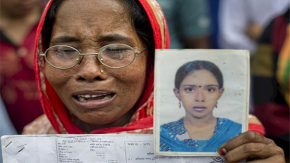 ผู้ชุมนุมวางพวงหรีดที่อนุสรณ์สถานคอนกรีตรูปฆ้อนและเคียว ยืนสวดภาวนาอย่างเงียบ ๆ หลายคนถือภาพถ่ายของผู้ที่ยังหายสาบสูญ เพราะช่วงที่อาคารถล่มมีผู้อยู่ข้างในประมาณ 3,500 คน แต่นับผู้เสียชีวิตได้ 1,130 คน บาดเจ็บอีกกว่า 2,000 คน ขณะที่คดีนี้ซึ่งถือว่าเป็นคดีฆาตกรรมถูกเลื่อนแล้วเลื่อนอีก และยังไม่มีผู้ถูกตัดสินโทษจนถึงขณะนี้