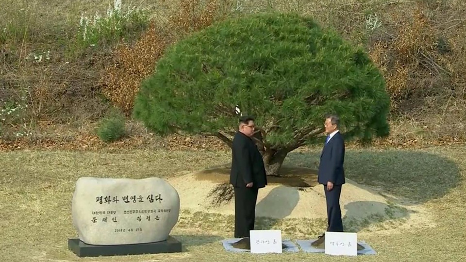 ผู้นำเกาหลีเหนือและผู้นำเกาหลีใต้ใช้พลั่วตักดินที่มาจากทั้งสองประเทศใส่ที่บริเวณโคนต้นสน พร้อมกับเปิดป้ายหินที่เขียนข้อความว่าปลูกสันติภาพและความเจริญรุ่งเรืองเหนือชื่อและตำแหน่งอย่างเป็นทางการของผู้นำทั้งสอง รายงานระบุว่า ผู้นำทั้งสองนั่งและเดินพูดคุยกันบนสะพานสีฟ้าเป็นการส่วนตัวก่อนที่จะกลับไปสู่การประชุมในช่วงบ่าย แต่ไม่ทราบแน่ชัดว่าผู้นำทั้งสองได้พูดคุยกันในเรื่องใด ด้านทำเนียบประธานาธิบดีเกาหลีใต้ออกแถลงการณ์ก่อนหน้าว่า นายมุนแสดงความพอใจหลังการประชุมสุดยอดกับนายคิมในรอบแรก แถลงการณ์ยังระบุว่า ผู้นำทั้งสองได้หารือเกี่ยวกับการทำให้คาบสมุทรเกาหลีปลอดจากอาวุธนิวเคลียร์ .-สำนักข่าวไทย