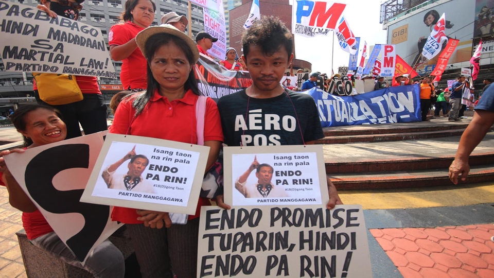 มะนิลา 1 พ.ค.- แรงงานและนักเคลื่อนไหวในฟิลิปปินส์เดินขบวนเนื่องในวันแรงงานสากลวันนี้ เรียกร้องให้ประธานาธิบดีโรดริโก ดูเตอร์เต ทำตามที่หาเสียงเลือกตั้งไว้เมื่อสองปีก่อนว่าจะยกเลิกสัญญาจ้างงานระยะสั้น