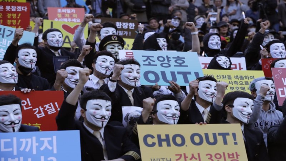 พนักงานที่มีทั้งนักบิน พนักงานต้อนรับบนเครื่องบิน และพนักงานส่วนอื่น ๆ สวมหน้ากากปิดบังใบหน้า ตะโกนประท้วงครอบครัวนายโช ยางโฮ ผู้ก่อตั้งบริษัทพร้อมกันว่า จะไม่ทนการด่าทอและการใช้อำนาจของครอบครัวนี้อีกต่อไป พร้อมกับถือป้ายขับไล่นายโชพ้นจากบริษัท นายปัก ชางจิน พนักงานต้อนรับบนเครื่องบินโคเรียนแอร์ที่ถูกนางโช ยุนอาห์ บุตรสาวคนโตของนายโชตะเพิดลงจากเครื่องบินที่ท่าอากาศยานนานาชาติจอห์น เอฟ เคนเนดีที่สหรัฐเมื่อปลายปี 2557 ตะโกนบอกกับเพื่อนร่วมงานว่า เขารักและภูมิใจในโคเรียนแอร์ ขอให้ทุกคนช่วยกันปกป้องโคเรียนแอร์