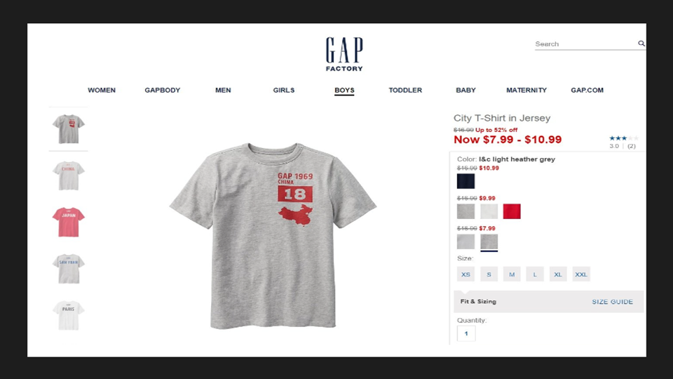 ทวิตเตอร์หนังสือพิมพ์พีเพิลเดลีของทางการจีนลงภาพเสื้อยืดที่เว็บไซต์แก๊ปขายในต่างประเทศ มีลายแผนที่จีนแผ่นดินใหญ่ที่หน้าอกด้านซ้าย แต่ไม่มีเกาะไต้หวันรวมอยู่ในแผนที่ด้วย ขณะที่หนังสือพิมพ์โกลบอลไทมส์รายงานว่า ลายแผนที่ดังกล่าวไม่มีทิเบตใต้และทะเลจีนใต้ และว่าเรื่องนี้กลายเป็นกระแสในโลกสังคมออนไลน์จีนเมื่อมีการส่งต่อภาพถ่ายเสื้อยืดดังกล่าวที่วางจำหน่ายในร้านแก๊ปในแคนาดา