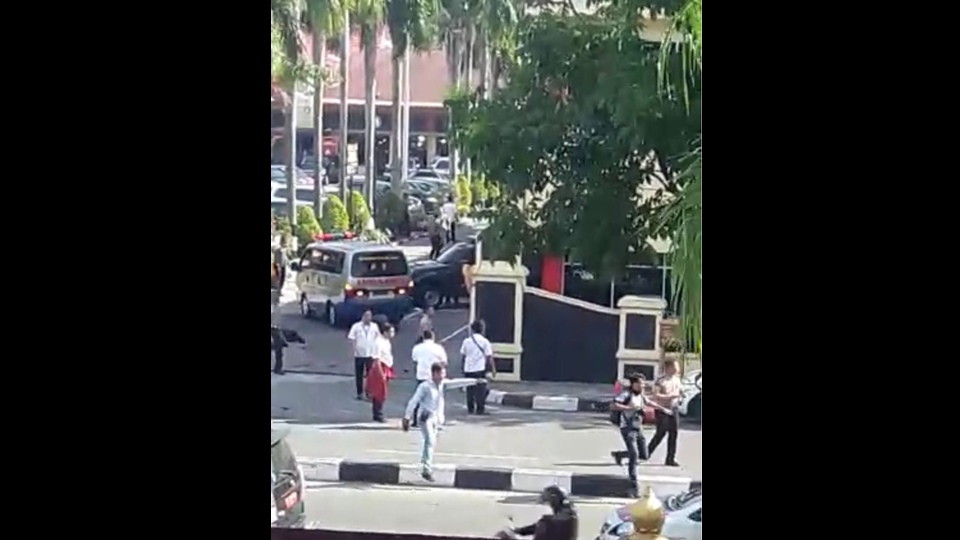 ทางด้านสื่ออื่นๆรายงานว่า รถยนต์คันหนึ่งซึ่งมีผู้โดยสารอย่างน้อย 3 คนพุ่งเข้าชนรั้วศูนย์บัญชาการตำรวจ จากนั้นคนที่สวมหน้ากากปิดบังใบหน้าออกมาจากรถและเข้าทำร้ายเจ้าหน้าที่ มีรายงานคาดว่าหนึ่งในชาย 3 คนที่ถูกยิงเสียชีวิตติดระเบิดไว้ที่ตัว ส่วนชายอีกคนถูกจับได้ และมีผู้ต้องสงสัย 4 คนที่หลบหนีไปจากที่เกิดเหตุ สำนักข่าวอันตาราของอินโดนีเซียรายงานว่า ผู้สื่อข่าว 2 คนซึ่งอยู่ที่ศูนย์บัญชาการตำรวจท่องถิ่นได้รับบาดเจ็บจากเหตุโจมตีในครั้งนี้ สถานีโทรทัศน์แพร่ภาพชายนอนกองอยู่ที่พื้นโดยมีดาบยาวอยู่ข้างตัว .-สำนักข่าวไทย