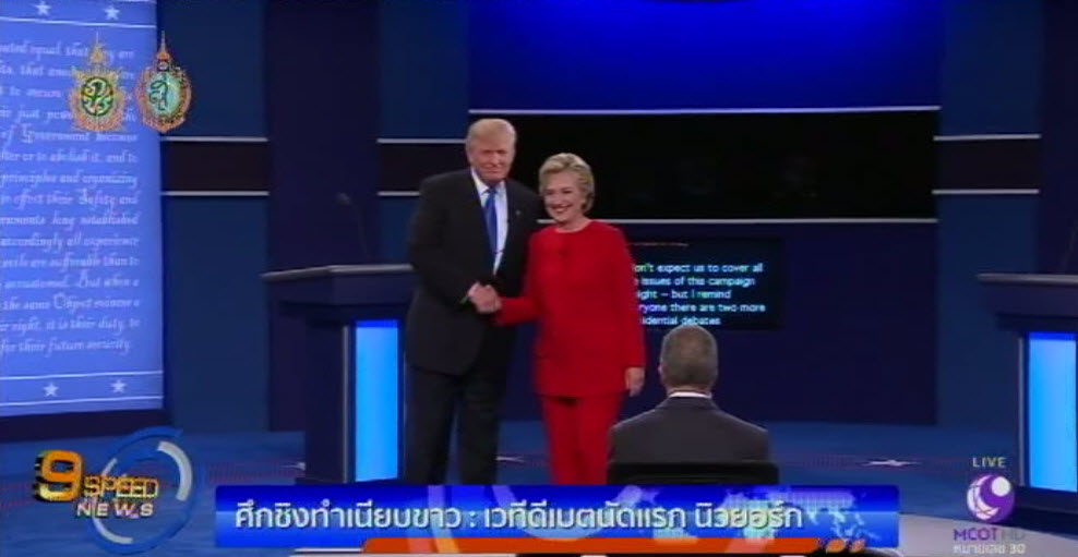สหรัฐ 27 ก.ย. – เริ่มขึ้นแล้วสำหรับเวทีดีเบตนัดแรก ระหว่างนางฮิลลารี คลินตัน ตัวแทนพรรคเดโมแครต กับนายโดนัลด์ ทรัมป์ ตัวแทนพรรครีพับลิกัน 2 ผู้สมัครชิงตำแหน่งประธานาธิบดีสหรัฐ ที่มหาวิทยาลัยฮอฟสตรา รัฐนิวยอร์ก โดยหัวข้อที่ดีเบตกันในวันนี้ มีทั้งหมด 3 หัวข้อ คือ อนาคตของอเมริกาจะไปในทิศทางไหน เราจะทำให้สหรัฐอเมริกามั่งคั่งได้อย่างไร และอเมริกาจะมีความปลอดภัยได้อย่างไร. – สำนักข่าวไทย