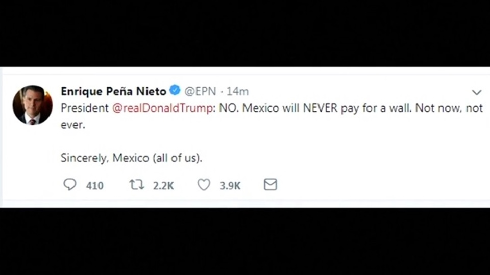 ผู้นำเม็กซิโกเขียนลงทวิตเตอร์ว่าไม่ โดยใส่สัญลักษณ์ถึงประธานาธิบดีทรัมป์ที่ @realDonaldTrump และลงท้ายว่า ด้วยความเคารพจากเม็กซิโก ก่อนหน้านี้ประธานาธิบดีทรัมป์กล่าววิจารณ์เม็กซิโกที่ไม่ช่วยสกัดกั้นผู้อพยพผิดกฎหมายลักลอบเข้าสหรัฐ รวมทั้งยังย้ำนโยบายของเขาที่เคยหาเสียงในการชิงตำแหน่งประธานาธิบดีสหรัฐว่า เม็กซิโกจะต้องจ่ายค่าก่อสร้างกำแพงกั้นแนวชายแดนสหรัฐ-เม็กซิโกตามที่เขาได้วางแผนไว้ .- สำนักข่าวไทย