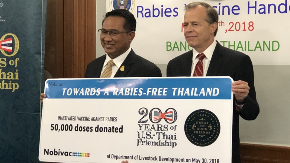วันนี้ นายกลิน ที เดวีส์ เอกอัครราชทูตสหรัฐอเมริกาประจำประเทศไทยเป็นตัวแทนรัฐบาลสหรัฐผ่านศูนย์ควบคุมและป้องกันโรคของสหรัฐ (CDC) และองค์การเพื่อการพัฒนาระหว่างประเทศของสหรัฐ (ISAID) มอบวัคซีนป้องกันโรคพิษสุนัขบ้าจำนวน 50,000 ชุด ให้แก่กรมปศุสัตว์ของไทย เพื่อสนับสนุนเป้าหมายของไทยที่จะกำจัดโรคพิษสุนัขบ้าให้หมดจากประเทศภายในปี 2563