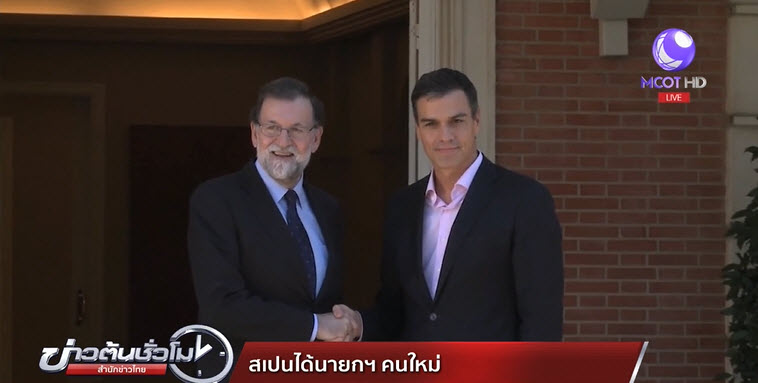 นายเปโดร ซานเชส วัย 46ปี หัวหน้าพรรคชาตินิยมฝ่ายค้านของสเปนได้รับการลงคะแนนโหวตจากสภาผู้แทนราษฎรให้ดำรงตำแหน่ง นายกรัฐมนตรี คนใหม่ของสเปนด้วยคะแนน 180 เสียง จากทั้งหมด 350 เสียง หลังจากที่นายกรัฐมนตรีมาริอาโน่ ราฮอย ถูกลงมติไม่ไว้วางใจและต้องหลุดจากตำแหน่งเนื่องจากปัญหาการทุจริคอร์รัปชั่นภายในรัฐบาล อย่างไรก็ดี นายซานเชส ยังต้องรอทำพิธีสาบานตนรับตำแหน่งเสียก่อน.-สำนักข่าวไทย