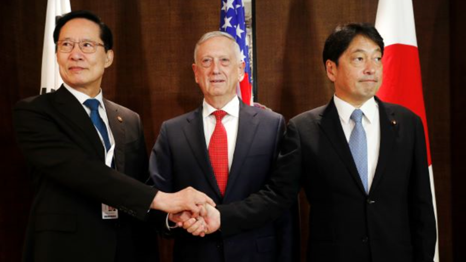 พล.อ.แมตทิสกล่าวระหว่างประชุมกับรัฐมนตรีกลาโหมเกาหลีใต้และญี่ปุ่นในวันนี้ นอกรอบการประชุมความมั่นคงเอเชียแชงกรีลา ไดอะล็อกที่สิงคโปร์ ก่อนที่จะมีการประชุมสุดยอดผู้นำสหรัฐและเกาหลีเหนือที่สิงคโปร์ในวันที่ 12 มิถุนายนว่า เกาหลีเหนือจะได้รับการผ่อนปรนมาตรการคว่ำบาตรต่อเมื่อได้แสดงให้เห็นว่าได้ดำเนินการปลดนิวเคลียร์อย่างสามารถพิสูจน์ได้และไม่สามารถเปลี่ยนกลับได้อีก ประชาคมโลกจะต้องบังคับใช้มาตรการคว่ำบาตรเกาหลีเหนือของคณะมนตรีความมั่นคงแห่งสหประชาชาติต่อไป และเพิ่มความร่วมมือทางกลาโหมมากขึ้นไปอีกเพื่อรักษาสันติภาพ ด้าน พล.ร.อ.ซง ยองมู รัฐมนตรีกลาโหมเกาหลีใต้กล่าวว่า สถานการณ์ในเกาหลีเหนือขณะนี้ทำให้ควรคาดการณ์ในแง่ดีอย่างระมัดระวังไว้ก่อน