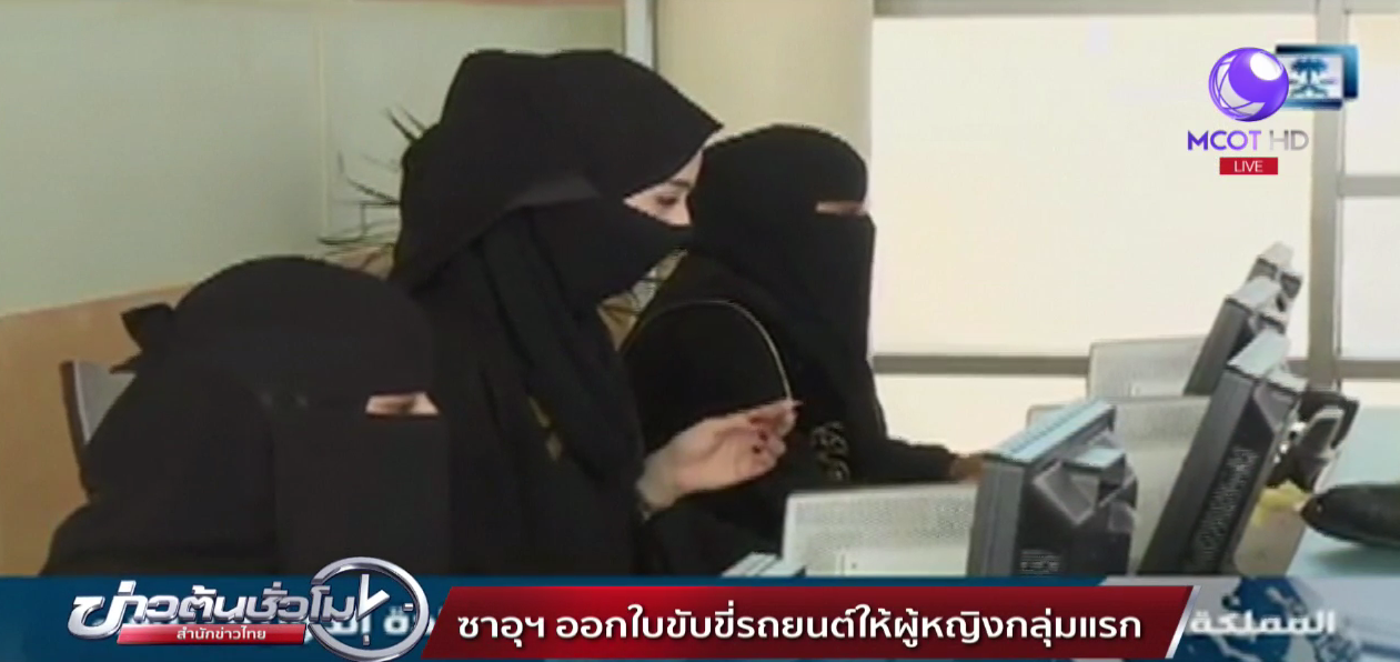 ซาอุดีอาระเบีย 5 มิ.ย.-ซาอุดีอาระเบียออกใบอนุญาตขับขี่รถยนต์ให้ผู้หญิง 10 คนเป็นกลุ่มแรก ก่อนจะมีการยกเลิกคำสั่งห้ามผู้หญิงขับรถยนต์อย่างเป็นทางการในวันที่ 24 มิถุนายนนี้ ผู้หญิง 10 คนกลุ่มนี้เป็นผู้ที่ถือใบขับขี่จากประเทศอื่นอยู่ก่อนแล้ว ทั้งหมดได้มาทดสอบการขับรถยนต์และทดสอบสายตาที่สำนักงานขนส่งในกรุงริยาด แต่ไม่มีการอนุญาตให้สื่อมวลชนเข้าทำข่าว.-สำนักข่าวไทย
