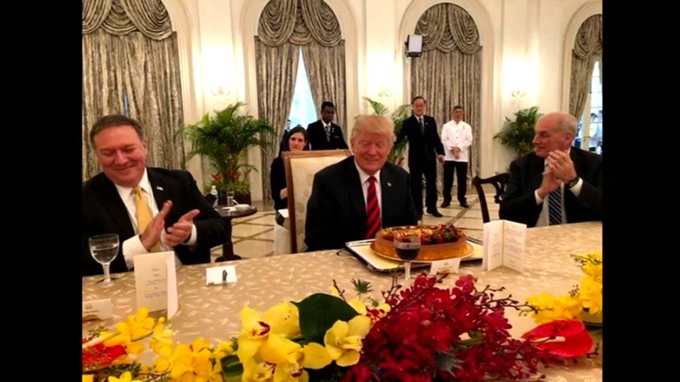 นายวิเวียน บาลากฤษนัน รัฐมนตรีต่างประเทศสิงคโปร์ทวีตภาพนิ่งประธานาธิบดีทรัมป์มองเค้กวันเกิดระหว่างร่วมรับประทานมื้อเที่ยงกับนายกรัฐมนตรีลี เซียนลุงของสิงคโปร์ โดยมีนายไมค์ พอมเพโอ รัฐมนตรีต่างประเทศสหรัฐและ พล.ร.อ.จอห์น เคลลี หัวหน้าคณะเจ้าหน้าที่ทำเนียบขาวนั่งขนาบข้าง นายบาลากฤษนันทวีตข้อความว่า ฉลองวันเกิดล่วงหน้า