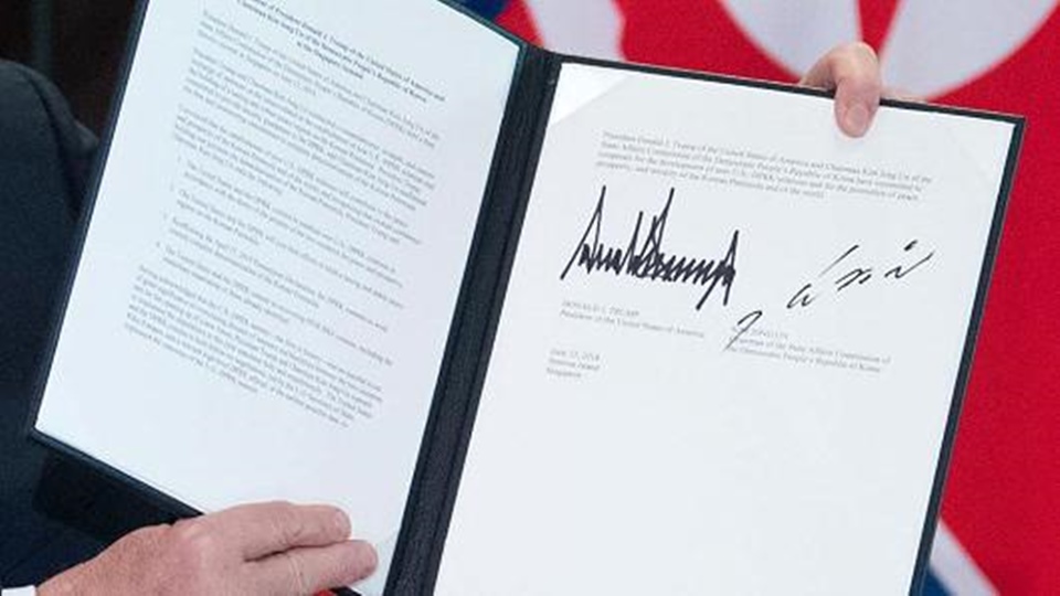 นายคิม จองอึน ผู้นำเกาหลีเหนือและประธานาธิบดีโดนัลด์ ทรัมป์ของสหรัฐลงนามเอกสารร่วมกันในช่วงก่อนบ่ายวันนี้ตามเวลาในไทย หลังเปิดการประชุมสุดยอดครั้งประวัติศาสตร์ที่สิงคโปร์ตั้งแต่เช้า นับเป็นครั้งแรกที่ผู้นำที่อยู่ในตำแหน่งของสองประเทศพบหน้ากัน เนื้อหาแถลงการณ์ร่วมระบุว่า ประธานาธิบดีทรัมป์และประธานคิมได้แลกเปลี่ยนทัศนะในเรื่องที่เกี่ยวกับการสร้างความสัมพันธ์ทวิภาคีใหม่ การสร้างระบอบสันติที่ยั่งยืนและรุ่งเรืองบนคาบสมุทรเกาหลี ประธานาธิบดีทรัมป์ให้คำมั่นว่าให้การรับรองความปลอดภัยแก่เกาหลีเหนือ ขณะที่ประธานคิมย้ำเรื่องความมุ่งมั่นที่จะทำให้คาบสมุทรเกาหลีปลอดนิวเคลียร์อย่างสมบูรณ์ ผู้นำทั้งสองขอแถลง 4 ข้อดังต่อไปนี้คือ
