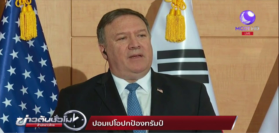 นายไมค์ ปอมเปโอ รัฐมนตรีต่างประเทศสหรัฐ ออกโรงแก้ต่างให้ประธานาธิบดีโดนัลด์ ทรัมป์ ที่ทวีตข้อความว่า เกาหลีเหนือไม่ได้เป็นภัยคุกคามด้านนิวเคลียร์อีกต่อไป โดยระบุว่า ประธานาธิบดีทรัมป์ ต้องการจะสื่อถึงเหตุการณ์ครั้งแรกในประวัติศาสตร์ที่ผู้นำสหรัฐนั่งโต๊ะหารือกับผู้นำเกาหลีเหนือ และเรื่องที่หารือเป็นเรื่องเกี่ยวกับสิ่งที่เกาหลีเหนือต้องเปลี่ยนแปลงเพื่อกลับเข้าสู่ประชาคมโลกอีกครั้ง.-สำนักข่าวไทย