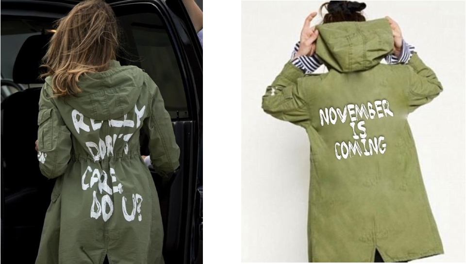แจ็กเก็ตตัวนี้ร้านเสื้อชื่อดังแห่งหนึ่งวางจำหน่ายตั้งแต่ฤดูร้อนปี 2559 ราคาตัวละ 39 ดอลลาร์สหรัฐ (ราว 1,280 บาท) ผู้คนในโลกสื่อสังคมออนไลน์พากันเปลี่ยนข้อความด้านหลังเสื้อ เช่น I really do care, do U? มีความหมายตรงข้ามกับเสื้อตัวนั้น November is coming หมายถึงการเลือกตั้งกลางสมัยในเดือนพฤศจิกายนนี้ I wore the heels on purpose เสียดสีที่นางทรัมป์สวมส้นสูงไปเยี่ยมผู้ประสบภัยเฮอริเคนฮาร์วีย์ที่รัฐเทกซัส Robert Mueller is my hero หมายถึงนายโรเบิร์ต มุลเลอร์ที่สอบสวนเรื่องรัสเซียแทรกแซงเลือกตั้งสหรัฐ I believe Stormy Daniels หมายถึงดาราหนังโป๊ที่เผยว่ามีสัมพันธ์ลึกซึ้งกับทรัมป์.-สำนักข่าวไทย