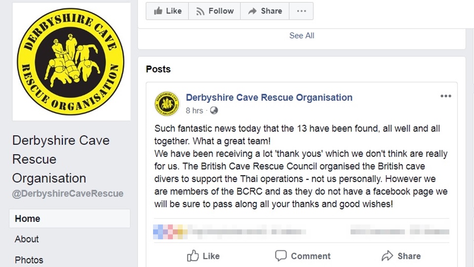 เฟซบุ๊ก Derbyshire Cave Rescue Organisation โพสต์เมื่อ 8 ชั่วโมงที่แล้วว่า มีข่าวอันแสนวิเศษในวันนี้ว่า พบเด็กทั้ง 13 คนแล้ว ทุกคนปลอดภัยและอยู่ในที่เดียวกัน เป็นทีมที่ยอดเยี่ยมมาก ทางองค์กรได้รับคำขอบคุณมากมายแต่ไม่ขอรับไว้เพียงผู้เดียว เพราะผู้ที่ดำเนินการเรื่องจัดส่งนักดำน้ำในถ้ำชาวอังกฤษไปสนับสนุนปฏิบัติการของไทยคือ คณะกรรมการกู้ภัยถ้ำอังกฤษ ไม่ใช่องค์กรดำเนินการเอง อย่างไรก็ดี ในฐานะที่เป็นสมาชิกของคณะกรรมการนี้และเนื่องจากคณะกรรมการไม่มีหน้าเฟซบุ๊ก องค์กรจึงขออาสาเป็นผู้ส่งต่อคำขอบคุณและความปรารถนาดีทั้งปวง