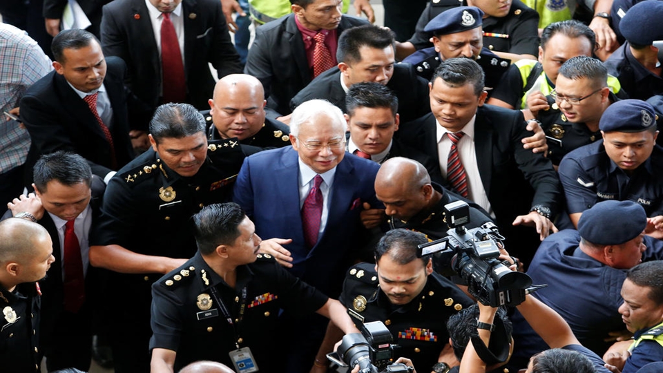 นายนาจิบวัย 64 ปี ถูกคณะกรรมการปราบปรามการทุจริต (เอ็มเอซีซี) ควบคุมตัวจากบ้านพักไปคุมขังที่เอ็มเอซีซีในกรุงปุตราจายาเมื่อวานนี้ และเดินทางมาขึ้นศาลในกรุงกัวลาลัมเปอร์เมื่อเวลา 08.20 น.วันนี้ตามเวลาท้องถิ่น ตรงกับเวลา 07.20 น.วันนี้ตามเวลาในไทยท่ามกลางกองทัพสื่อมวลชนและฝูงชนจำนวนมาก โดยมีสมาชิกพรรคอัมโนจำนวนหนึ่งถือป้ายสนับสนุน สื่อมาเลเซียรายงานว่า นายทอมมี โธมัส อัยการสูงสุดจะเป็นผู้นำคณะฟ้องร้องดำเนินคดี แหล่งข่าวคาดว่า นายนาจิบจะถูกฟ้องหลายข้อหาเรื่องเงิน 42 ล้านริงกิต (ราว 344 ล้านบาท) ของเอสซีอาร์อินเตอร์เนชันนัล อดีตบริษัทในเครือ 1MDB ถูกโอนเข้าบัญชีธนาคารส่วนตัวของเขา