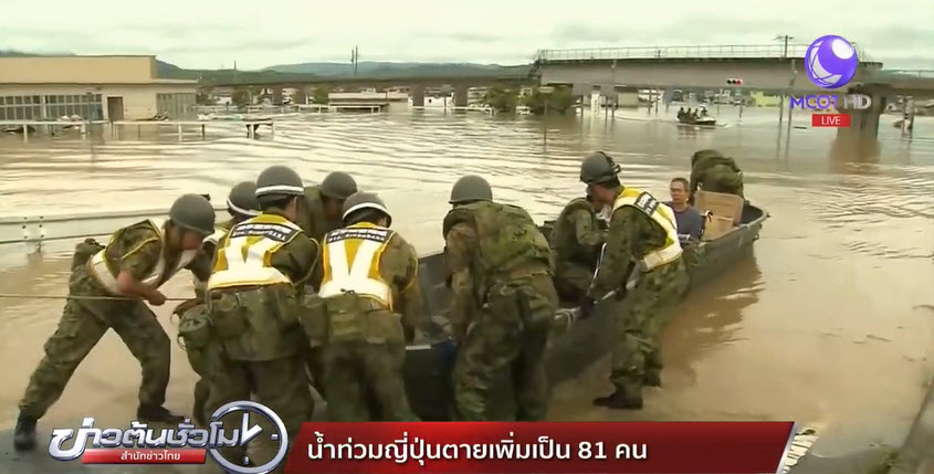 รัฐบาลญี่ปุ่น แถลงว่ายอดผู้เสียชีวิตจากฝนตกหนักมากเป็นประวัติการณ์ในพื้นที่ภาคตะวันตกของประเทศเพิ่มขึ้นเป็นอย่างน้อย 81 คนแล้ว และมีผู้ได้รับบาดเจ็บสาหัสอีก 8 คน มีผู้สูญหายอีก 57 คน จังหวัดฮิโรชิมาได้รับผลกระทบมากที่สุด มีผู้เสียชีวิต 37 คน ส่วนจังหวัดเอฮิเมะมีผู้เสียชีวิต 21 คน ขณะที่หน่วยกู้ภัยและทหารตระเวนค้นหา และให้ความช่วยเหลือในทุกพื้นที่ ท่ามกลางสภาพพื้นที่น้ำท่วม และเต็มไปด้วยดินโคลน ซึ่งทุกปฏิบัติการต้องแข่งกับเวลา เพื่อหวังช่วยเหลือผู้ประสบอุทกภัยให้ทันท่วงที เนื่องจากระดับน้ำเพิ่มสูงขึ้น และเกิดความเสี่ยงจากดินโคลนถล่ม ซึ่งล่าสุดมีการสั่งอพยพประชาชนไปแล้วกว่า 2 ล้านคน.-สำนักข่าวไทย