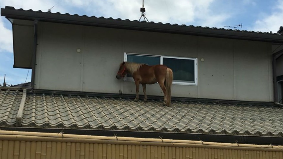 คูราชิกิ 11 ก.ค.- ม้าแคระที่พยายามเอาชีวิตรอดด้วยการว่ายหนีน้ำท่วมขึ้นไปอยู่บนหลังคาบ้านสร้างความประทับใจให้ชาวญี่ปุ่นทั้งประเทศที่กำลังเอาใจช่วยผู้ประสบภัยน้ำท่วมหนักทางภาคตะวันตกของประเทศ มีผู้เสียชีวิตไม่ต่ำกว่า 179 คนแล้ว