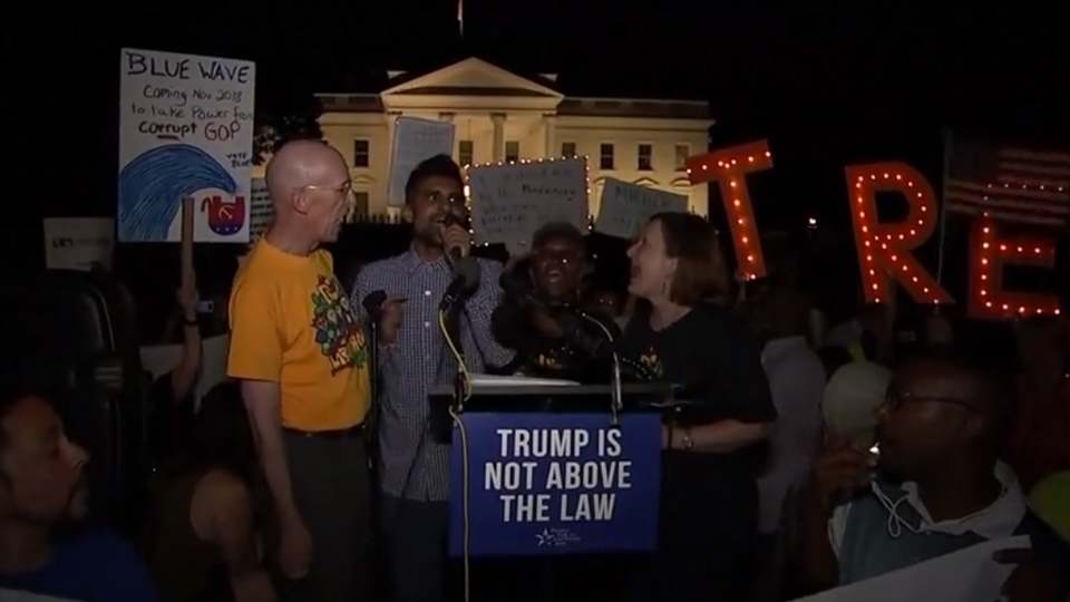 วอชิงตัน 19 ก.ค.- กลุ่มผู้ประท้วงชุมนุมที่ด้านนอกทำเนียบขาวในวันพุธมาสามคืนติดต่อกันแล้ว เพื่อแสดงพลังคัดค้านการที่ประธานาธิบดีโดนัลด์ ทรัมป์ประชุมสุดยอดกับประธานาธิบดีวลาดิเมียร์ ปูตินของรัสเซียที่กรุงเฮลซิงกิของฟินแลนด์ที่ผ่านมา