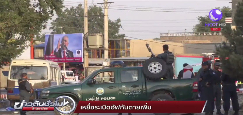 อัฟกานิสถาน 23 ก.ค. – ยอดผู้เสียชีวิตจากเหตุระเบิดฆ่าตัวตายหน้าสนามบินในกรุงคาบูลของอัฟกานิสถาน เมื่อวานนี้ เพิ่มขึ้นเป็น 23 คนแล้ว ในจำนวนนี้มีคนขับรถของสำนักข่าวเอพีรวมอยู่ด้วย และมีผู้ได้รับบาดเจ็บอีก 107 คน