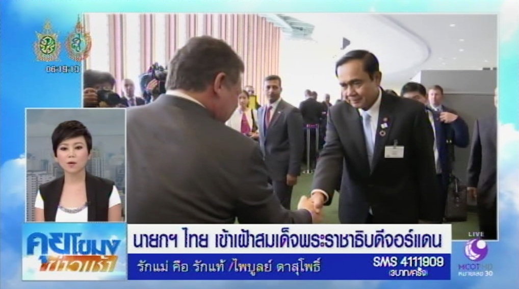 ด้านภารกิจของ พล.อ.ประยุทธ์ จันทร์โอชา นายกรัฐมนตรีและหัวหน้าคณะรักษาความสงบแห่งชาติ (คสช.) ซึ่งเดินทางเข้าร่วมการประชุมสมัชชาสหประชาชาติครั้งที่ 71 ระหว่างวันที่ 18-25 กันยายน ที่นครนิวยอร์ก ได้เข้าเฝ้าฯ และหารือทวิภาคีกับสมเด็จพระราชาธิบดีอับดุลเลาะห์ที่ 2 สมเด็จพระราชาธิบดีแห่งราชอาณาจักรฮัชไมต์จอร์แดน ณ สำนักงานใหญ่สหประชาชาติ ในโอกาสที่ความสัมพันธ์ทวิภาคีระหว่างไทยและจอร์แดนจะครบรอบ 50 ปีแห่งการสถาปนาความสัมพันธ์ทางการทูตระหว่างกัน ในวันที่ 10 พฤศจิกายนนี้ โดยจะจัดกิจกรรมต่างๆ อย่างต่อเนื่อง และคณะรัฐมนตรีได้ให้ความเห็นชอบเปิดสถานเอกอัครราชทูตจอร์แดนประจําประเทศไทยแล้ว นายกรัฐมนตรียังกล่าวชื่นชมบทบาทของจอร์แดนในการรักษาสันติภาพภายในประเทศ รวมทั้งการให้ความช่วยเหลือผู้ลี้ภัยชาวปาเลสไตน์และผู้ลี้ภัยชาวซีเรีย ทั้ง 2 ฝ่ายยังได้ติดตามความคืบหน้าความร่วมมือต่างๆ อาทิ ความร่วมมือด้านความมั่นคง ความร่วมมือด้านฝนหลวง และด้านการศึกษา โดยขอให้หน่วยงานที่เกี่ยวข้องหารือร่วมกันอย่างต่อเนื่องต่อไป. -สำนักข่าวไทย