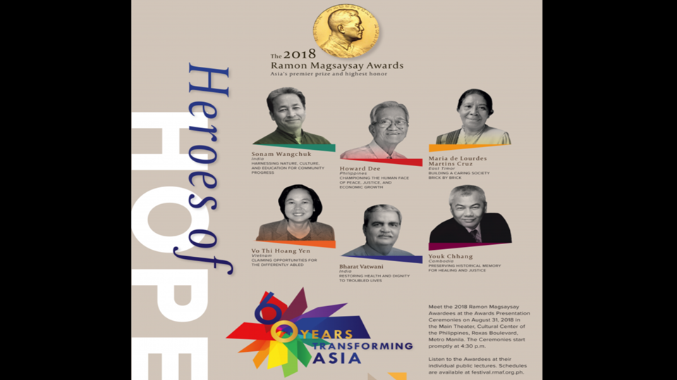 มะนิลา 26 ก.ค.- มูลนิธิรางวัลรามอน แมกไซไซของฟิลิปปินส์ประกาศชื่อผู้ได้รับรางวัลประจำปีนี้ซึ่งเป็นปีที่ 60 แล้ว ประกอบด้วยชาวกัมพูชา ชาวติมอร์-เลสเต ชาวฟิลิปปินส์ ชาวเวียดนาม และชาวอินเดีย 2 คน