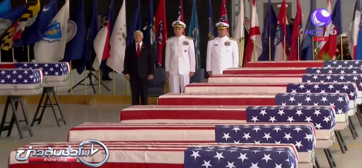 ประธานาธิบดีโดนัลด์ ทรัมป์ ของสหรัฐ ทวีตข้อความขอบคุณนายคิม จองอึน ผู้นำเกาหลีเหนือ ที่ทำตามสัญญาในการส่งร่างและกระดูกของทหารอเมริกันที่เสียชีวิตในสงครามเกาหลีคืนให้แก่สหรัฐ และขอบคุณที่นายคิมส่งจดหมายแสดงมิตรไมตรีมาให้ก่อนหน้านี้ โดยหวังว่าจะได้พบกับนายคิมอีกเร็วๆ นี้ ร่างและกระดูกของทหารอเมริกันซึ่งบรรจุอยู่ในหีบศพ 55 หีบ ถูกส่งจากเกาหลีใต้ได้มายังฐานทัพเพิร์ลฮาร์เบอร์บนเกาะฮาวายเมื่อวานนี้ มีรองประธานาธิบดีไมค์ เพนซ์ เข้าร่วมในพิธีรับมอบอย่างเป็นทางการ.-สำนักข่าวไทย