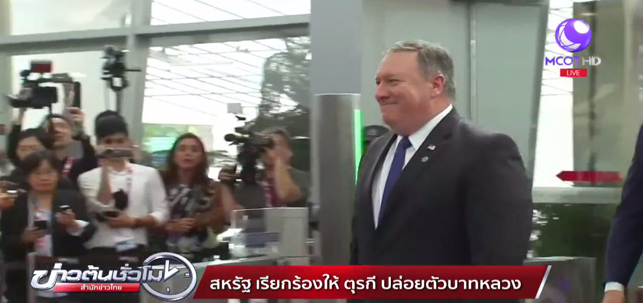 นายไมค์ ปอมเปโอ รัฐมนตรีต่างประเทศสหรัฐ ระบุกรณีสหรัฐคว่ำบาตรตุรกีแสดงให้เห็นว่าสหรัฐจริงจังในการเรียกร้องให้ตุรกีปล่อยตัวนายแอนดรู บรันสัน บาทหลวงชาวอเมริกัน จากการถูกกักบริเวณในบ้านพัก หลังถูกจำคุกเป็นเวลา 2 ปี ในข้อหาจารกรรม และสนับสนุนกลุ่มก่อการร้าย คำกล่าวของนายปอมเปโอมีขึ้นก่อนที่เขาจะพบหารือกับนายเมฟลุท คาวูโซกลู รัฐมนตรีต่างประเทศตุรกี ระหว่างเข้าร่วมการประชุมความมั่นคงในเอเชียที่สิงคโปร์ วันนี้ .-สำนักข่าวไทย