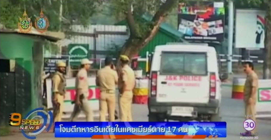 18 ก.ย. – กลุ่มนักรบมุสลิมในแคชเมียร์บุกโจมตีกองบัญชาการทหารอินเดีย ใกล้พรมแดนปากีสถาน มีทหารอินเดียเสียชีวิตอย่างน้อย 17 คน นับเป็นการโจมตีครั้งรุนแรงที่สุดของแคชเมียร์ในรอบ 2-3 ปีที่ผ่านมา สำหรับนักรบที่บุกเข้าโจมตีมี 4 คน มีสมญาว่า ฟิดายีน หมายถึงนักรบที่ยอมสละชีวิต ทั้งหมดเสียชีวิต กองทัพอินเดียได้ส่งเฮลิคอปเตอร์อพยพทหารบาดเจ็บ 35 คน ไปโรงพยาบาล พร้อมตอบโต้การโจมตีอีกนานนับชั่วโมง เหตุการณ์โจมตีนี้เกิดขึ้นขณะที่ยังมีความตึงเครียดในแคชเมียร์เกี่ยวกับการชุมนุมประท้วงหลังนักรบหัวหน้าขบวนการเคลื่อนไหวเพื่อเอกราชถูกสังหาร. -สำนักข่าวไทย