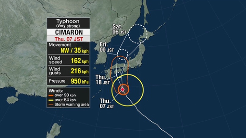 รายงานระบุว่า ไต้ฝุ่นซีมารอนมีลมกระโชกแรงสูงสุด 216 กิโลเมตรต่อชั่วโมง เมื่อเวลาประมาณ 06.00 น.วันนี้ตามเวลาในไทย เคลื่อนตัวอยู่ห่างจากทางตะวันออกเฉียงใต้ของเกาะโกโตะราว 280 กิโลเมตร คาดว่า พายุซีมารอนจะพัดขึ้นฝั่งในคืนวันนี้ตามเวลาท้องถิ่น และมุ่งหน้าไปทางตอนเหนือในเช้าวันศุกร์ ซึ่งมีคำเตือนว่า อิทธิพลของพายุจะทำให้เกิดฝนตกหนักและกระแสลมแรง และมีคำเตือนให้เฝ้าระวังดินถล่ม น้ำท่วม น้ำล้นตลิ่ง ลมแรง และคลื่นสูง สำนักอุตุนิยมวิทยาญี่ปุ่นระบุว่า บางพื้นที่ในเขตตอนกลางของประเทศอาจมีฝนตกหนักวัดปริมาณน้ำฝนได้ถึง 800 มิลลิเมตร หรือ 31 นิ้วใน 24 ชั่วโมงจนถึงเที่ยงวันศุกร์ พื้นที่เสี่ยงรวมถึงพื้นที่ที่กำลังอยู่ในระหว่างฟื้นฟูหลังจากเกิดน้ำท่วมและดินถล่มจากฝนตกหนักเมื่อเดือนกรกฎาคมที่ผ่านมาที่มีผู้เสียชีวิตไปกว่า 200 คน.-สำนักข่าวไทย