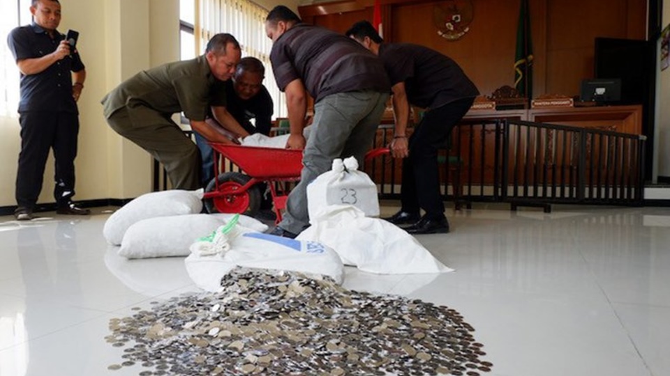 โซโล 24 ส.ค.- ข้าราชการชายชาวอินโดนีเซียได้จ่ายค่าเลี้ยงดูก้อนโตที่ติดค้างกับภรรยาเก่าด้วยเหรียญทั้งหมดคิดเป็นมูลค่าราว 10,000 ดอลลาร์ (330,000 บาท)