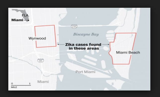 นายริค สกอตต์ ผู้ว่าการรัฐฟลอริดาแถลงเมื่อเย็นวันศุกร์ตามเวลาท้องถิ่นว่า ขยายพื้นที่ซิกาแพร่เชื้อเป็น 3 เท่า ครอบคลุมย่านที่เป็นแหล่งท่องเที่ยวยอดนิยม หลังจากสำนักงานสาธารณสุขฟลอริดาพบผู้ติดเชื้อรายใหม่ในพื้นที่ดังกล่าว เป็นสตรี 3 คน ชาย 2 คน ทั้งหมดแสดงอาการในช่วง 1 เดือนที่ผ่านมา ทำให้ขณะนี้รัฐฟลอริดามีผู้ติดเชื้อซิกาที่ไม่ได้เกิดจากการเดินทางแล้ว 93 ราย เฉพาะเมืองไมแอมีบีชมีถึง 35 ราย นายกเทศมนตรีเมืองไมแอมีบีชสั่งให้เจ้าหน้าที่เริ่มฉีดพ่นยากำจัดลูกน้ำยุงลายตั้งแต่วันนี้