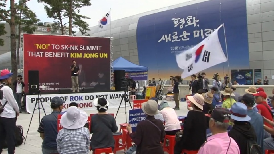 กลุ่มผู้ประท้วงหลายสิบคนร่วมชุมนุมที่ด้านหน้าอาคารทงแดมุนดีไซน์พลาซ่า(ดีดีพี)ซึ่งเป็นสถานที่ตั้งศูนย์สื่อมวลชนที่ติดตามข่าวประชุมสุดยอดเกาหลีและร้องตะโกนต่อต้านเกาหลีเหนือ ผู้ประท้วงวัย 52 ปีกล่าวเรียกว่า เป็นการประชุมสุดยอดที่ไม่ปกติและว่าประธานาธิบดีมุน แจอินไม่ควรพบกับนายคิม จองอึน ผู้นำเกาหลีเหนือ นายคิมและคณะเจ้าหน้าที่เกาหลีเหนือมาให้การต้อนรับนายมุนทันทีที่เดินทางถึงกรุงเปียงยางเมื่อเช้านี้ เพื่อรื้อฟื้นความตกลงปลดชนวนนิวเคลียร์ที่สหรัฐและเกาหลีเหนือเจรจากันไว้และแนวโน้มการทำข้อตกลงสันติภาพยุติสงครามเกาหลีอย่างเป็นทางการ ส่วนในวันพุธผู้นำเกาหลีเหนือและเกาหลีใต้มีกำหนดวางแผนการเจรจารอบสองระดับคณะเจ้าหน้าที่ และจะออกแถลงการณ์ร่วมกัน รวมทั้งข้อตกลงทางทหารเพื่อปลดชนวนความตึงเครียดและป้องกันเหตุปะทะกันทางทหาร ประธานาธิบดีมุนมีกำหนดเดินทางกลับเกาหลีใต้ในวันพฤหัสบดี .- สำนักข่าวไทย