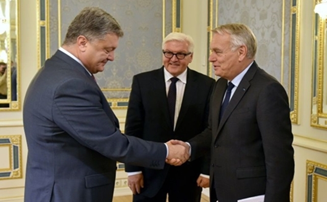 นายฌอง-มาร์ก ไอยโรลต์ รัฐมนตรีต่างประเทศฝรั่งเศสและนายแฟรงก์-วอลเตอร์ สไตน์ไมเออร์ รัฐมนตรีต่างประเทศเยอรมนีเดินทางถึงเมืองครามาทอร์สก์ที่อยู่ในความควบคุมของกองทัพรัฐบาล และถูกชาวยูเครนประมาณ 40 คนประท้วงหน้าสำนักงานคณะสังเกตการณ์พิเศษขององค์การว่าด้วยความมั่นคงและความร่วมมือในยุโรป (โอเอสซีอี) เนื่องจากทั้งคู่ได้ขอให้รัฐบาลยูเครนยึดมั่นตามแผน 13 ประการในข้อตกลงมินส์กเมื่อเดือนกุมภาพันธ์ปีก่อนว่าจะให้สิทธิปกครองตนเองบางส่วนแก่กลุ่มกบฏในแคว้นโดเนตส์กและลูกันส์กโดยไม่แยกดินแดนจากยูเครน ซึ่งเป็นข้อตกลงที่ชาวยูเครนส่วนใหญ่ไม่พอใจ