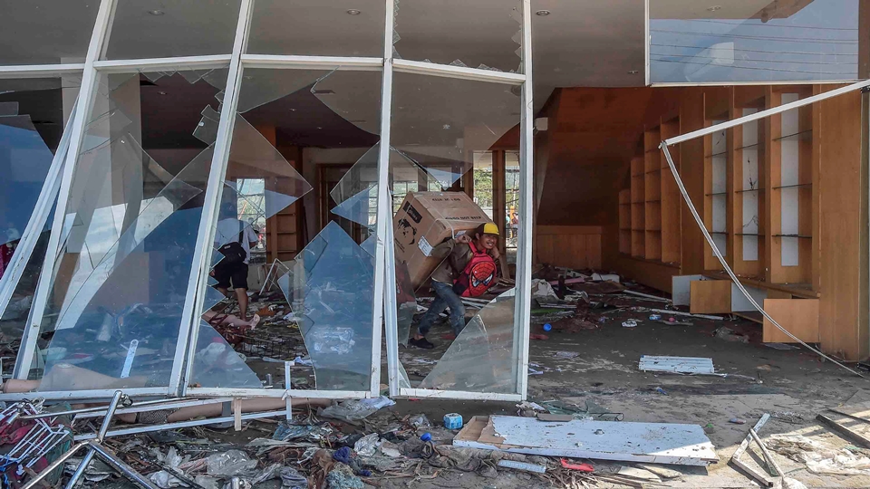 รัฐมนตรีมหาดไทยอินโดนีเซียตอบข้อถามเรื่องรายงานข่าวมีการปล้นสะดมร้านค้าว่า ได้สั่งการให้เจ้าหน้าที่เร่งจัดส่งอาหารและน้ำดื่ม ให้ผู้ประภัย ส่วนร้านค้าที่ถูกปล้นสะดมทางการจะให้การชดเชย คลิปที่เผยแพร่ในยูทูบเห็นผู้คนแย่งกันหยิบฉวยสิ่งของจากรถบรรทุกคันหนึ่ง ขณะที่สถานีโทรทัศน์ออกอากาศภาพประชาชนตะโกนร้องขออาหารในระหว่างที่ทหารแจกจ่ายสิ่งของหม้จากรถบรรทุกคันหนึ่ง และภาพผู้ประสบภัยเข้าไปรื้อค้นเสื้อผ้าและข้าวของจากห้างสรรพสินค้าที่พังเสียหาย ด้านสำนักงานโลจิสติกส์แจ้งว่า เตรียมลำเลียงข้าวของรัฐบาลหลายร้อยตันไปยังพื้นที่ประสบภัยในจังหวัดสุลาเวสีกลาง ขณะที่สื่ออ้างรัฐมนตรีคลังว่า รัฐบาลได้จัดสรรงบฟื้นฟูแล้ว 560,000 ล้านรูเปียห์ (ราว 1,214 ล้านบาท)