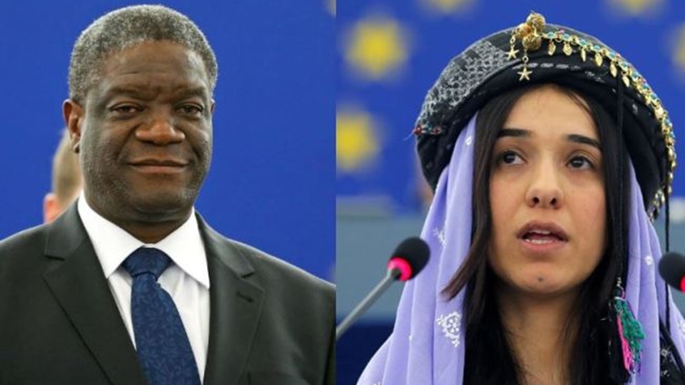 แถลงการณ์ของคณะกรรมการโนเบลนอร์เวย์ระบุว่า นพ.เดนนิส มุคเวจี สูตินรีแพทย์วัย 63 ปี อุทิศชีวิตปกป้องเหยื่อความรุนแรงทางเพศในสาธารณรัฐประชาธิปไตยคองโก โรงพยาบาลปันซีที่เขาตั้งขึ้นในเมืองบูกาวูในปี 2551 รักษาเหยื่อความรุนแรงทางเพศมาแล้วหลายพันคน ส่วนใหญ่เกิดขึ้นท่ามกลางสงครามกลางเมืองยืดเยื้อที่คร่าชีวิตชาวคองโกไปไม่ต่ำกว่า 6 ล้านคน นพ.มุคเวจีประณามการข่มขืนหมู่ที่ไม่ได้รับโทษอยู่เสมอ อีกทั้งยังวิจารณ์รัฐบาลคองโกและหลายประเทศที่ไม่หยุดยั้งการใช้ความรุนแรงทางเพศกับสตรีเป็นยุทธศาสตร์และอาวุธในการทำสงคราม