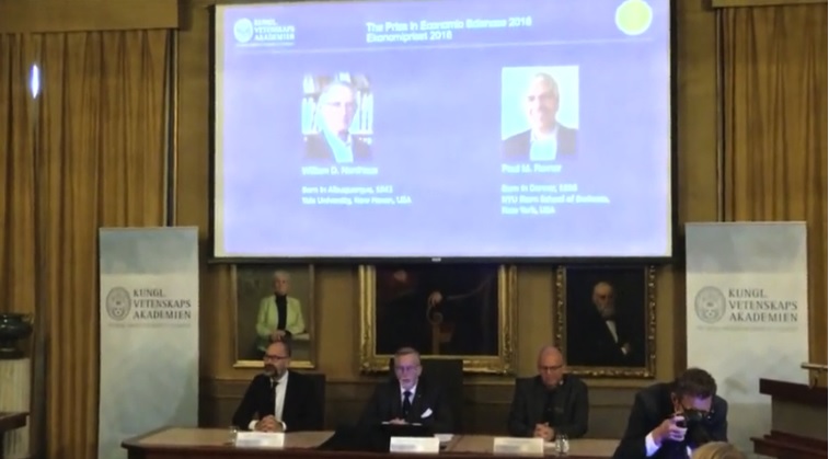ราชวิทยาลัยวิทยาศาสตร์แห่งสวีเดน ซี่งเป็นผู้พิจารณามอบรางวัลโนเบล สาขาเศรษฐศาสตร์ กล่าวในแถลงการณ์ว่า นอร์ดเฮาส์ วัย 77 ปี เป็นศาสตราจารย์ จากมหาวิทยาลัยเยล และโรเมอร์ วัย 62 ปี อดีตหัวหน้านักเศรษฐศาสตร์ของธนาคารโลก ที่ขณะนี้สอนอยู่ที่วิทยาลัยธุรกิจสเติร์น มหาวิทยาลัยนิวยอร์ก การค้นพบของทั้งสองช่วยทำให้ขอบเขตของการวิเคราะห์ทางเศรษฐศาสตร์ขยายวงกว้างออกไปอย่างชัดเจน ด้วยการสร้างรูปแบบที่สามารถอธิบายว่า เศรษฐกิจแบบตลาดมีปฏิสัมพันธ์กับธรรมชาติและความรู้ได้อย่างไร นอร์ดเฮาส์ ได้รับรางวัลในการค้นพบวิธีการผสมผสานการเปลี่ยนแปลงสภาพภูมิอากาศให้เป็นการวิเคราะห์เศรษฐศาสตร์มหภาคในระยะยาว ในขณะที่ โรเมอร์ ได้รางวัลจากการผสมผสานนวัตกรรมทางด้านเทคโนโลยีให้เป็นการวิเคราะห์ทางด้านเศรษฐศาสตร์มหภาค การประกาศรางวัลโนเบลสาขาเศรษฐศาสตร์ในวันนี้ถือเป็นการปิดฉากการประกาศรางวัลโนโบลประจำปี 2018 โดยไม่มีการประกาศผู้รับรางวัลในสาขาวรรณกรรม ที่เลื่อนออกไปเป็นครั้งแรกในรอบ 70 ปี จากกรณีอื้อฉาวที่เชื่อมโยงถึงสามีของคณะกรรมการคัดเลือกรางวัลโนเบลท่านหนึ่งได้กระทำล่วงละเมิดทางเพศ.-สำนักข่าวไทย