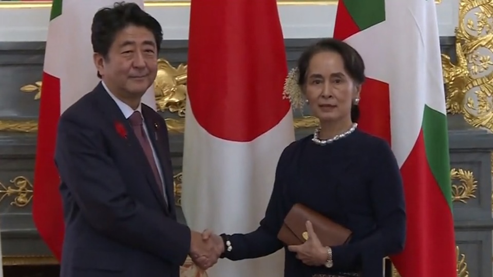 นายอาเบะกล่าวในระหว่างแถลงข่าวร่วมภายหลังการหารือกับนางซู จีว่า ญี่ปุ่นพร้อมจะให้การสนับสนุนความพยายามของเมียนมาในการจัดหาที่อยู่ให้แก่ชาวโรฮิงญาที่เดินทางกลับจากค่ายลี้ภัยในบังกลาเทศ และว่า ปัญหานี้มีความซับซ้อน ญี่ปุ่นขอให้การสนับสนุนเมียนมาในการแก้ไขปัญหา และว่า การสอบสวนโดยคณะกรรมการอิสระนับเป็นสิ่งสำคัญอย่างยิ่งในการคลี่คลายปัญหา