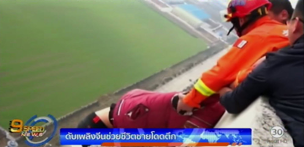 จีน 15 ธ.ค. – สถานีโทรทัศน์ซีซีทีวีของทางการจีนรายงานว่า เจ้าหน้าที่ดับเพลิงเมืองซูโจว มณฑลอันฮุย ช่วยชีวิตชายคนหนึ่งที่ใช้แท่งเหล็กทุบตีตนเองและพยายามกระโดดจากดาดฟ้าอาคาร 30 ชั้น เพื่อฆ่าตัวตาย เพราะปัญหาความสัมพันธ์ส่วนตัว โดยเจ้าหน้าที่ดับเพลิงรายหนึ่งเข้าไปทางด้านหลัง ก่อนคว้าตัวเขาให้ออกจากริมดาดฟ้า ระหว่างที่เจ้าหน้าที่ดับเพลิงคนอื่นเบี่ยงเบนความสนใจของชายคนดังกล่าว. – สำนักข่าวไทย