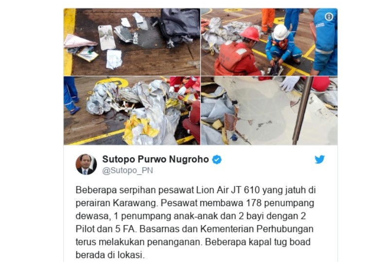 เว็บไซต์บรรษัทกระจายเสียงอังกฤษ (บีบีซี) เผยแพร่ทวิตเตอร์ของนายซูโตโป ปูร์โว นูโกรโฮ หัวหน้าฝ่ายประชาสัมพันธ์ คณะกรรมการการจัดการภัยพิบัติแห่งชาติอินโดนีเซีย (บีเอ็นพีบี) ที่ลงภาพสัมภาระและซากเครื่องบินหลายภาพ พร้อมทวีตภาษาอินโดนีเซียว่า ซากหลายชิ้นของเครื่องบินไลอ้อนแอร์เที่ยวบิน JT 610 ที่ตกในน่านน้ำเมืองการาวัง เครื่องบินลำนี้มีผู้โดยสารผู้ใหญ่ 178 คน เด็ก 1 คน ทารก 2 คน นักบิน 2 คน และพนักงานต้อนรับบนเครื่องบิน 5 คน บาซาร์นาส (สำนักงานค้นหาและกู้ภัยแห่งชาติอินโดนีเซีย) และกระทรวงคมนาคมกำลังดูแลสถานการณ์อยู่ มีเรือโยงหลายลำอยู่ในที่เกิดเหตุแล้ว นอกจากนี้ยังได้แชร์คลิปที่ระบุว่าถ่ายจากเรือโยงลำหนึ่งนอกเมืองการาวัง จังหวัดชวาตะวันตก ห่างจากกรุงจาการ์ตาไปทางตะวันออกราว 51.2 กิโลเมตร ภาพในคลิปเห็นซากบางอย่างลอยน้ำอยู่